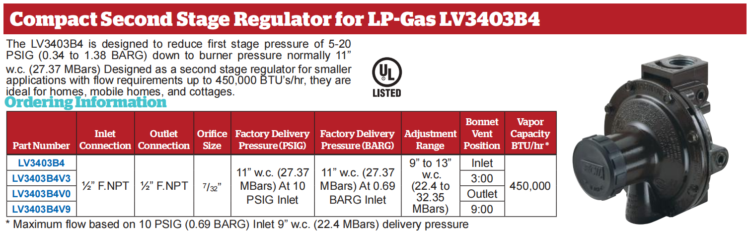该 LV3403B4 专门设计为第一级压力 5 - 20PS IG (0.34至1.38 BAR ),将燃烧器压力降到通常为 11“W . c .(27.37 MBars ),流量可达 450 , 000 B TU / hr ,适用于家庭、大厨房。